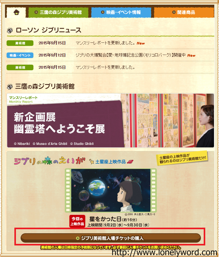吉卜力博物馆是宫崎骏亲手建设的博物馆,实在是值得一看,但买票需要提前买,否则可能无法买到票。买票的方式要么通过淘宝代理,但1000日元的票会卖到100元或者更高,或者去日本的Lawson便利店的Loppi机器上买。每个月的票是上个月10号开始卖,每周二或特殊的时期关门。每天的参观时间有四个时间点:10点,12点,14点和16点。很多人都以为在国外无法直接预约买票,其实是可以的买的,但是在Lawson的买票页面需要选择信用卡支付,下面介绍一下票是怎么买的