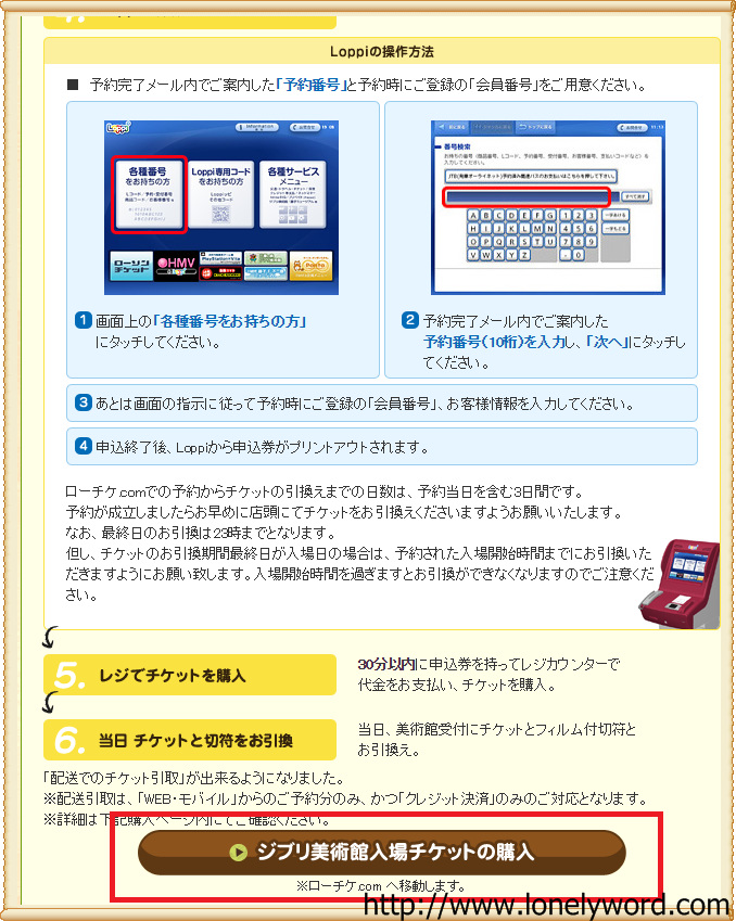 往下拉有Loppi取互联网订票的方法,然后猛击下方的棕色长条按钮