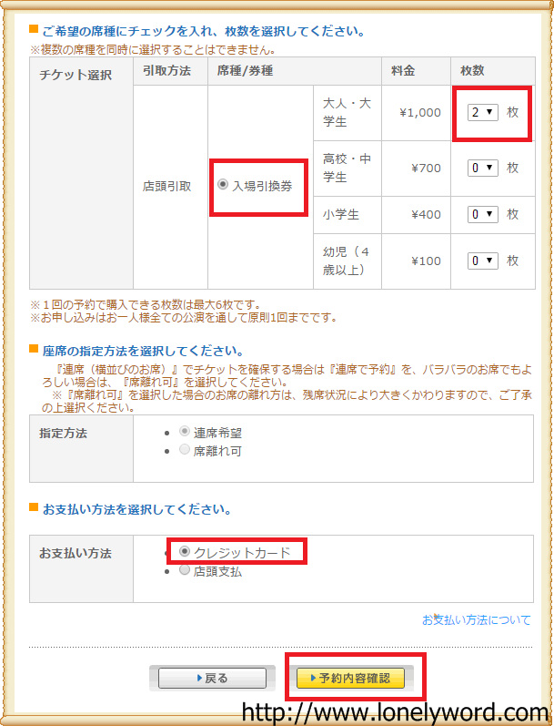 然后回到之前的页面,往下找到“入場引換券”并点击,选择对应的人数,然后在お支払い方法一栏选择クレジットカード(信用卡支付),这块一定要选信用卡支付,否则只能三天内到Lawson店内支付,然后点击黄色按钮